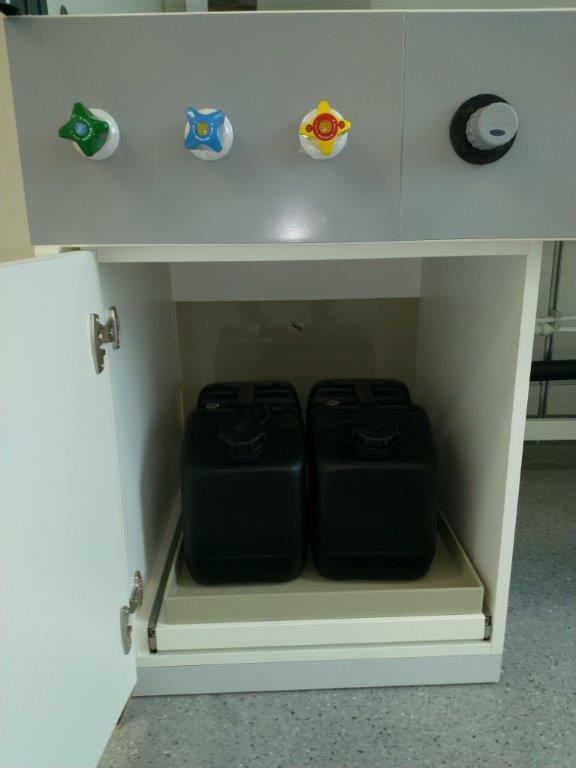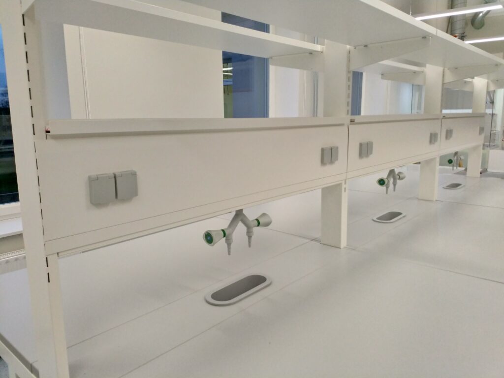 Athla Type III teenindusmoodul reguleeritava kõrgusega riiuli ja puutelülitiga dimmerdava LED valgustiga. Elektripistikute asukohta saab kasutaja muuta vastavalt vajadusele tänu teenindusmooduli paneel lahendusele
